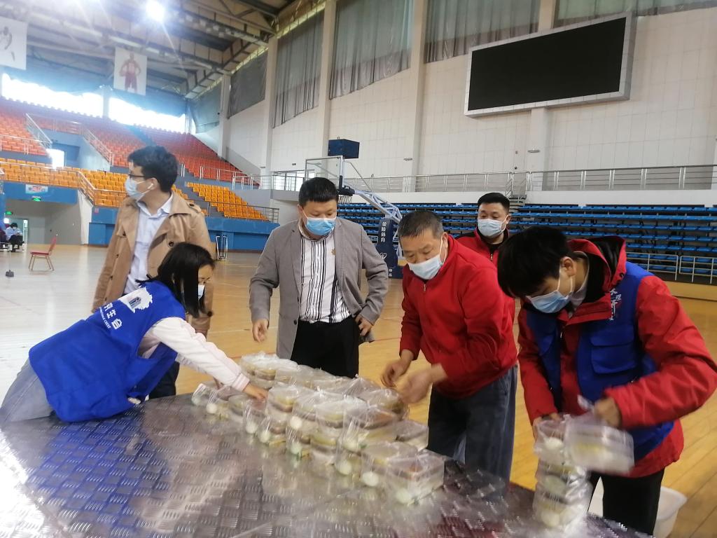 大家分工明确,有的站在食堂门口,拿着大喇叭,提示进出食堂的人员严格佩戴口罩、扫场所码、保持一米距离、提倡打包带走;有的到食堂显眼位置张贴防疫宣传海报;有的帮忙打包、装箱盒饭;有的负责为奋战在抗疫一线的战士们运送、分发盒饭……