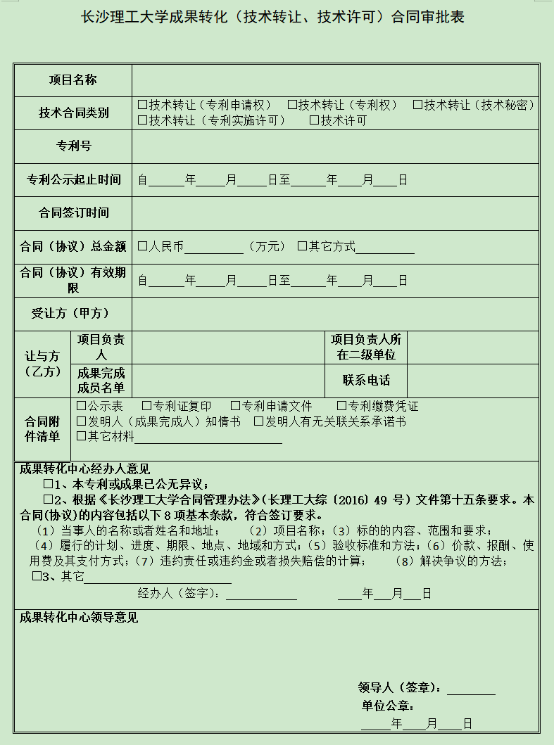 长沙理工大学成果转化(技术转让、技术许可)合同审批表