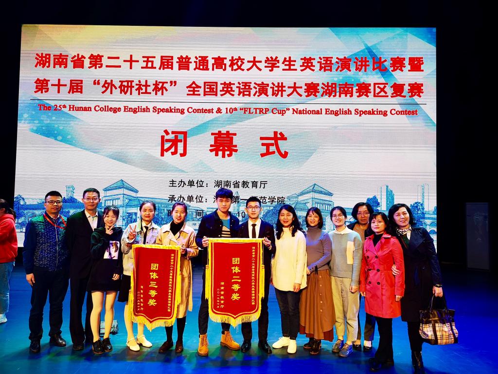 在10月27日结束的湖南省第二十五届普通高校大学生英语演讲比赛暨第十届“外研社杯”全国演讲大赛湖南赛区复赛中,我校代表队获得竞赛一组团体二等奖(第一名),城南学院代表队获得竞赛二组团体三等奖。其中我校汽车与机械工程学院阳学恒获得非专业组个人一等奖(第二名),经济与管理学院陈颖仪获得非专业组个人三等奖,外国语学院英语1701班陈康获得专业组个人三等奖。城南学院市场营销专业陈宜群,李姗姗获得非专业组个人三等奖,方涵娜获得专业组个人三等奖。指导老师为张志武、刘力、潘莹、孙文娟、彭娅以及王浩萍。